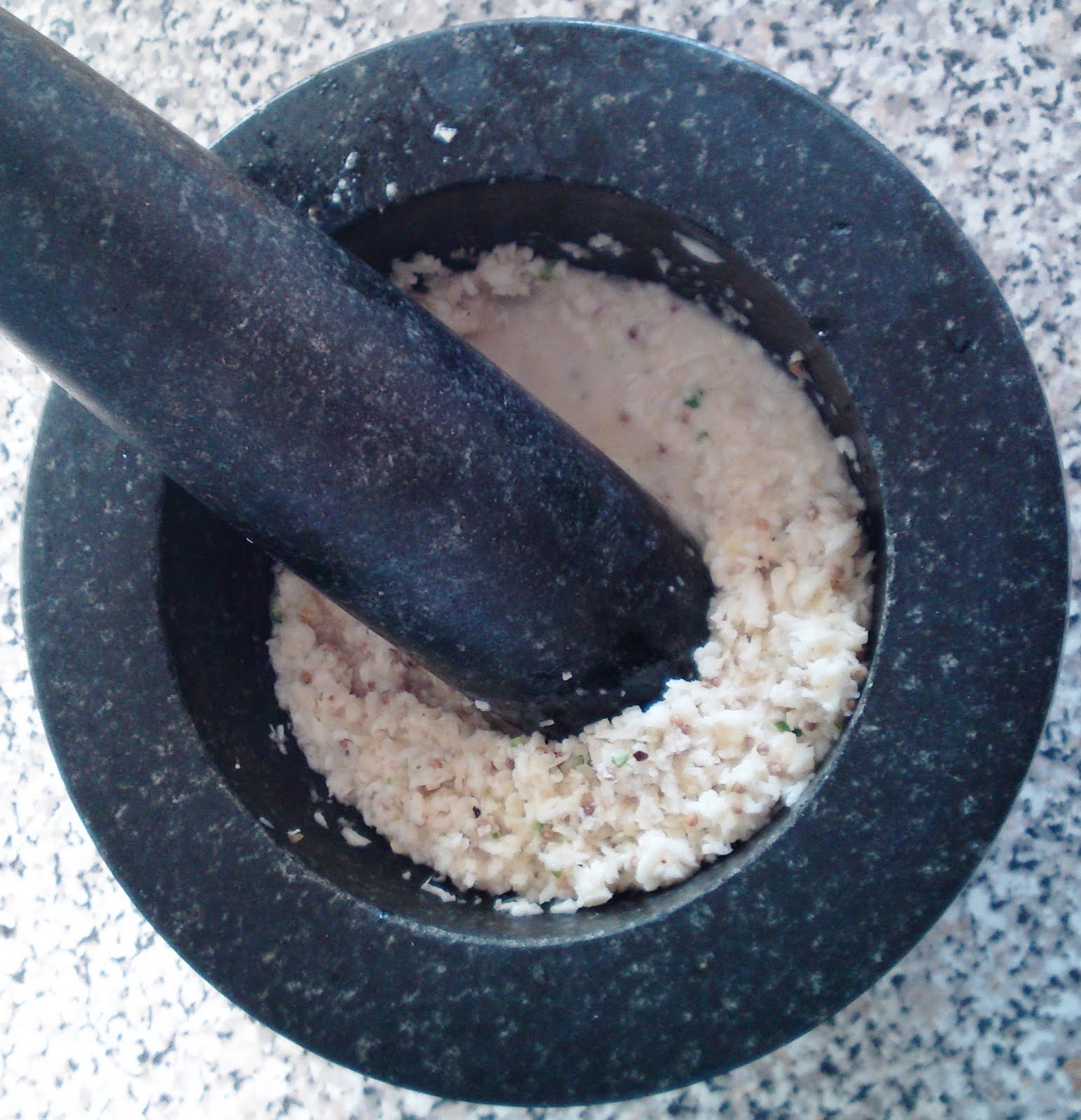 1) First prepare the chutney. Chop the coconut flesh into very small pieces, and put it into a pestle and mortar with the jaggery, the juice of one lime and the onion. Add about 1 tbsp of water and bash to a pulp. Coconut is quite sturdy stuff so you might get bored with this and resort to a food processor. I did. Process to a very coarse pulp.