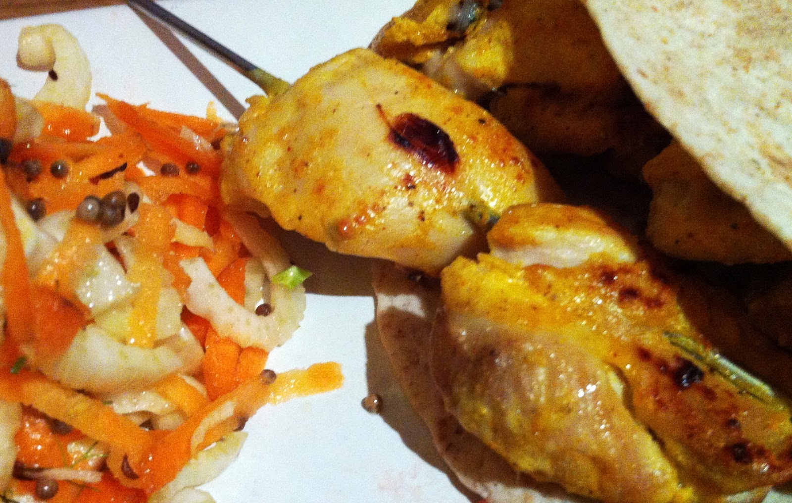 6. Serve immediately with warmed chapattis or naan, the carrot and fennel salad and some home made of shop bought raita.