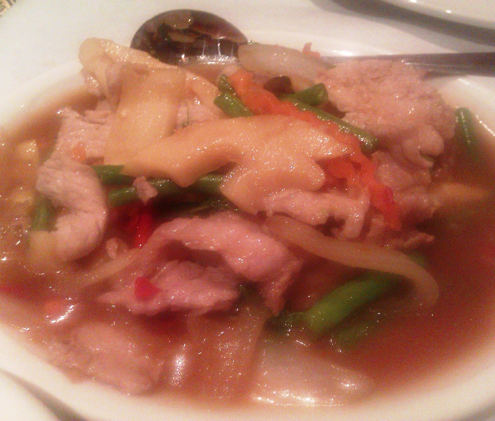 What was left of a slow roasted leg of pork was going to be sliced thinly and flash fried with garlic and ginger, but the joint wasn't as fatty as I'd anticipated and so the remaining meat was overdone. Moisture was needed.